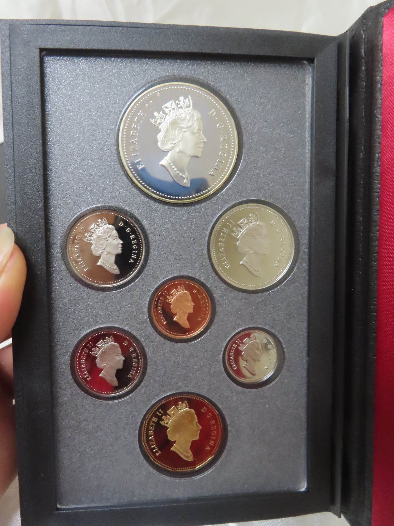 1993 Double Dollar Proof Set. Silver Dollar marks the centennial of Governor General of Canada Lord Stanley presenting the Stanley Cup to the winning hockey team. 7-coin Proof Set. All coins have Ultra Heavy Cameos. Housed in its original Royal Canadian Mint case of issue. Includes Certificate of Authenticity.