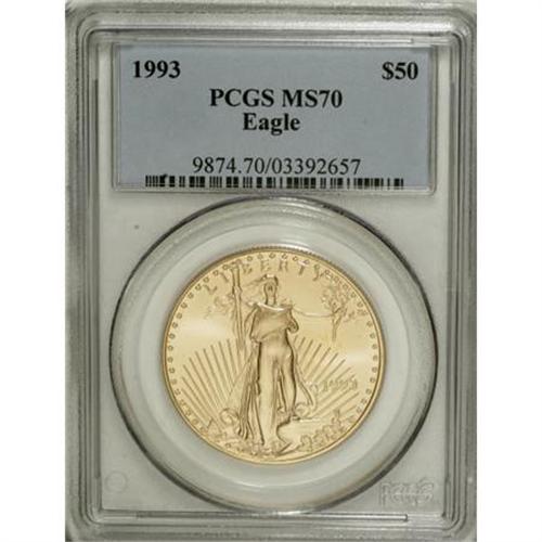 <B>1993 G$50 One-Ounce Gold Eagle MS70 PCGS.</B></I> PCGS Population (38/0). NGC Census: (0/0). Mintage: 480,192. Numismedia Wsl. Price for NGC/PCGS coin in MS70: $1,000. (#9874)<BR><BR><b>Shipping:</b> Coins & Currency (<a target="_blank" href="http://www.heritageauctions.com/common/shipping.php">view shipping information</a>)