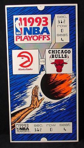 Here's a fabulous gift for the Bulls fan with a long memory! A wildly "oversized" ticket - 15 × 29 × for an Atlanta Hawks Vs Chicago Bulls 1993 NBA Playoff game! The "ticket" is heavyweight cardboard, unframed, and printed on both sides. Slight corner bumping and light creases near the edge don't detract - what a great gift for the Bulls fan!