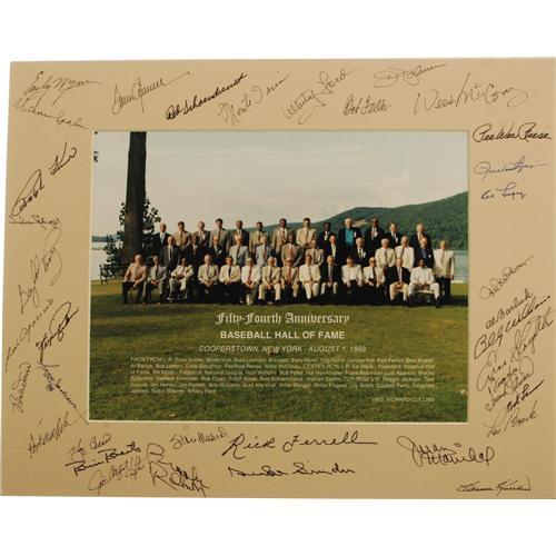<B>1993 Hall of Fame Induction Ceremonies Multi-Signed Photograph.</B></I> Official group portrait snapped at the fifty-fourth anniversary of the opening of the Baseball Hall of Fame in Cooperstown derives from the personal collection of the Hall's top corporate sponsor. These beautiful oversized displays were made available only to players and a very few VIP's, and were never offered to the general public. The mat surrounding the photo bears the 10/10 black and blue sharpie signatures of thirty-seven Hall of Famers pictured, including Spahn, Wynn, Seaver, Ford, Palmer, McCovey, Reese, Barlick, Kell, Brock, Killebrew, Snider, Musial, Brooks Robinson, Hunter, Reggie Jackson, Doerr, Stargell, Kiner and many more. Total dimensions 16x20". <I>LOA from PSA/DNA. LOA from James Spence Authentication.</B></I><BR><BR><b>Shipping:</b> Flat Material, Large (<a target="_blank" href="http://www.heritageauctions.com/common/shipping.php">view shipping information</a>)