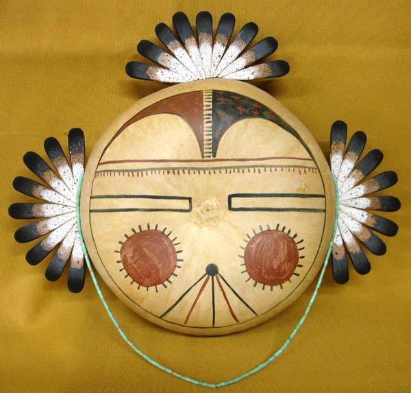 Painted Gourd Mask by Robert Rivera. Signed on the back, ''Robert Rivera copyright 1991, Placitas, New Mexico, Gourd Mask 3/10/93.'' Measures 12''wx10''h. With Turquoise bead necklace. Buyers Pay Actual Shipping and Handling Charges(see terms and conditions for more information).