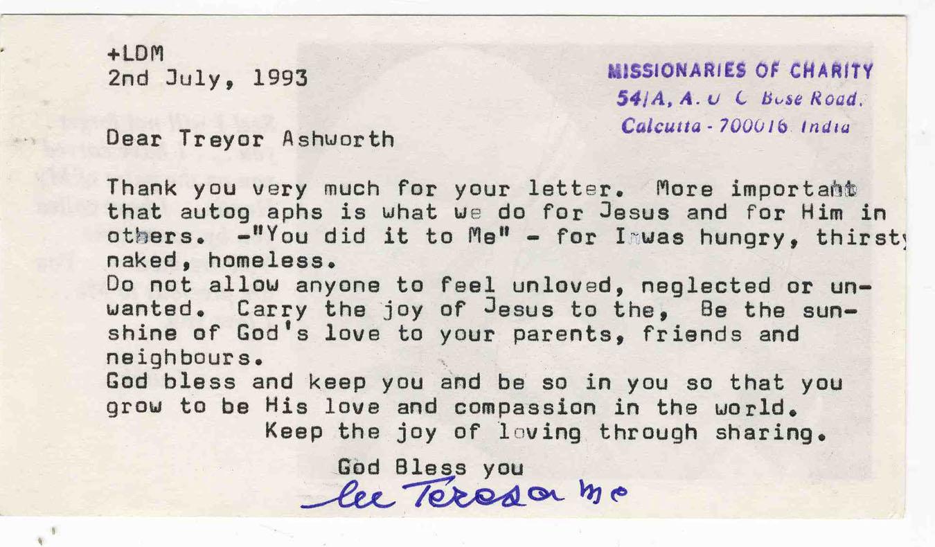 Mother Teresa typed letter signed. Dated 2 July 1993 and composed to the verso of a ''Missionaries of Charity'' photo card showing Mother Teresa holding a baby. In part: “…Do not allow anyone to feel unloved, neglected or unwanted. Carry the joy of Jesus…Be the sunshine of God's love to your parents, friends and neighbors…God Bless you…” Signed in bold blue ink at conclusion. Accompanied by cover. Excellent condition.