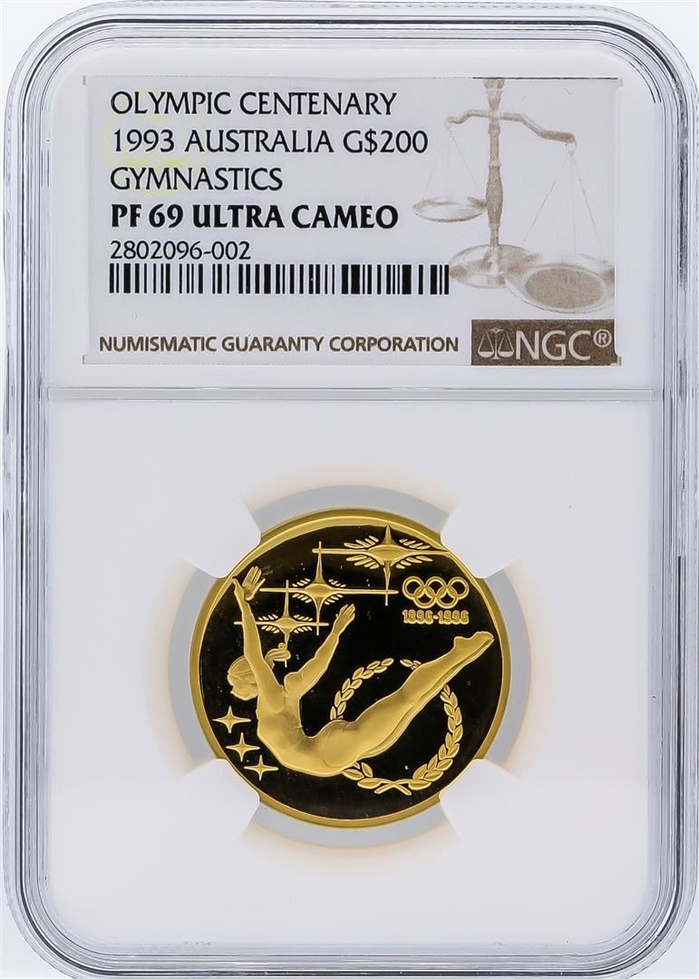 One 1993 NGC PF69 Ultra Cameo Australia $200 Olympic Gymnastics Centenary Gold Coin. NGC Certified.