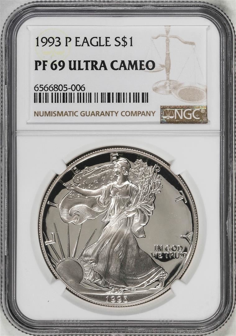 One 1993-P $1 Proof American Silver Eagle Coin NGC PF69 Ultra Cameo. NGC Certified.