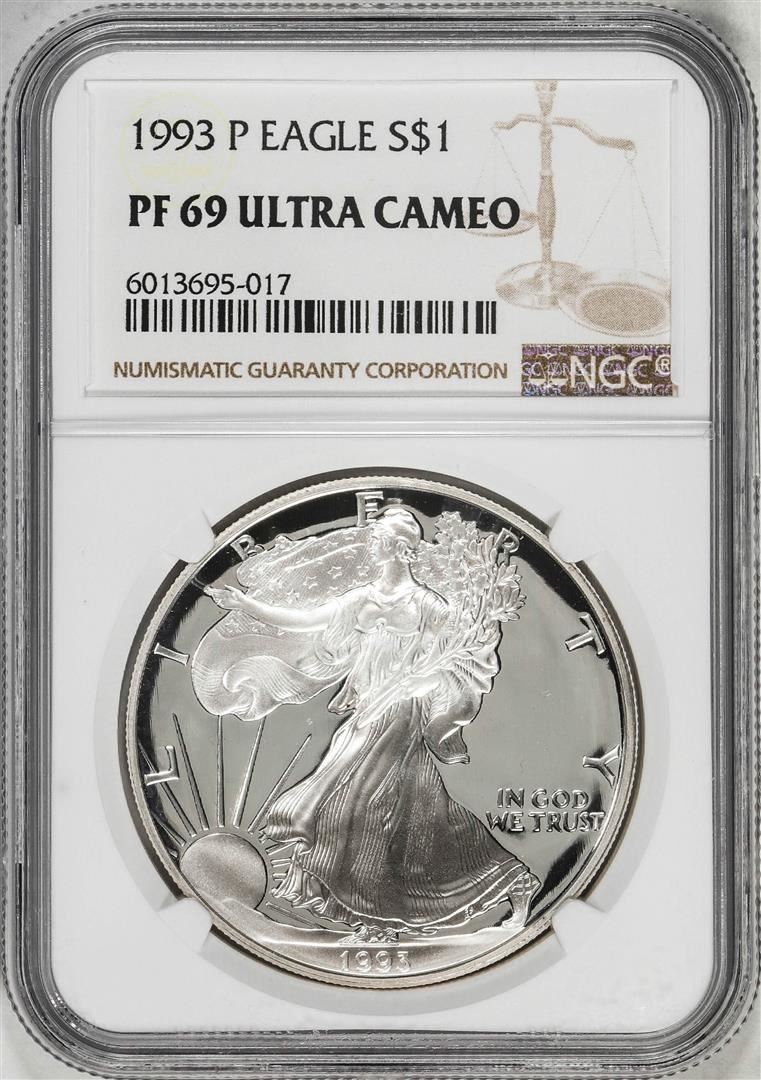 One 1993-P $1 Proof American Silver Eagle Coin NGC PF69 Ultra Cameo. NGC Certified.