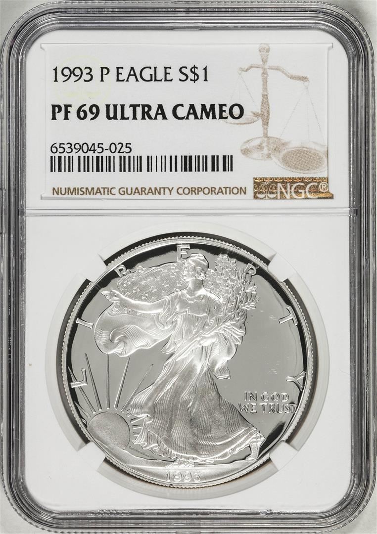 One 1993-P $1 Proof American Silver Eagle Coin NGC PF69 Ultra Cameo. NGC Certified.