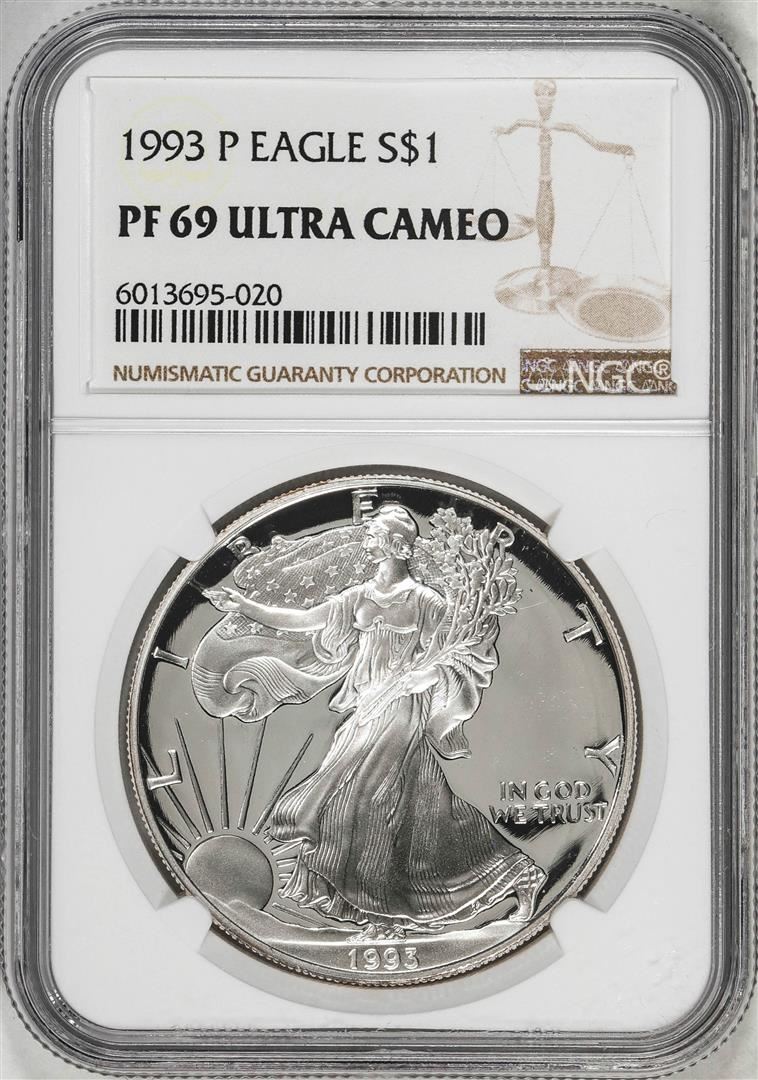 One 1993-P $1 Proof American Silver Eagle Coin NGC PF69 Ultra Cameo. NGC Certified.