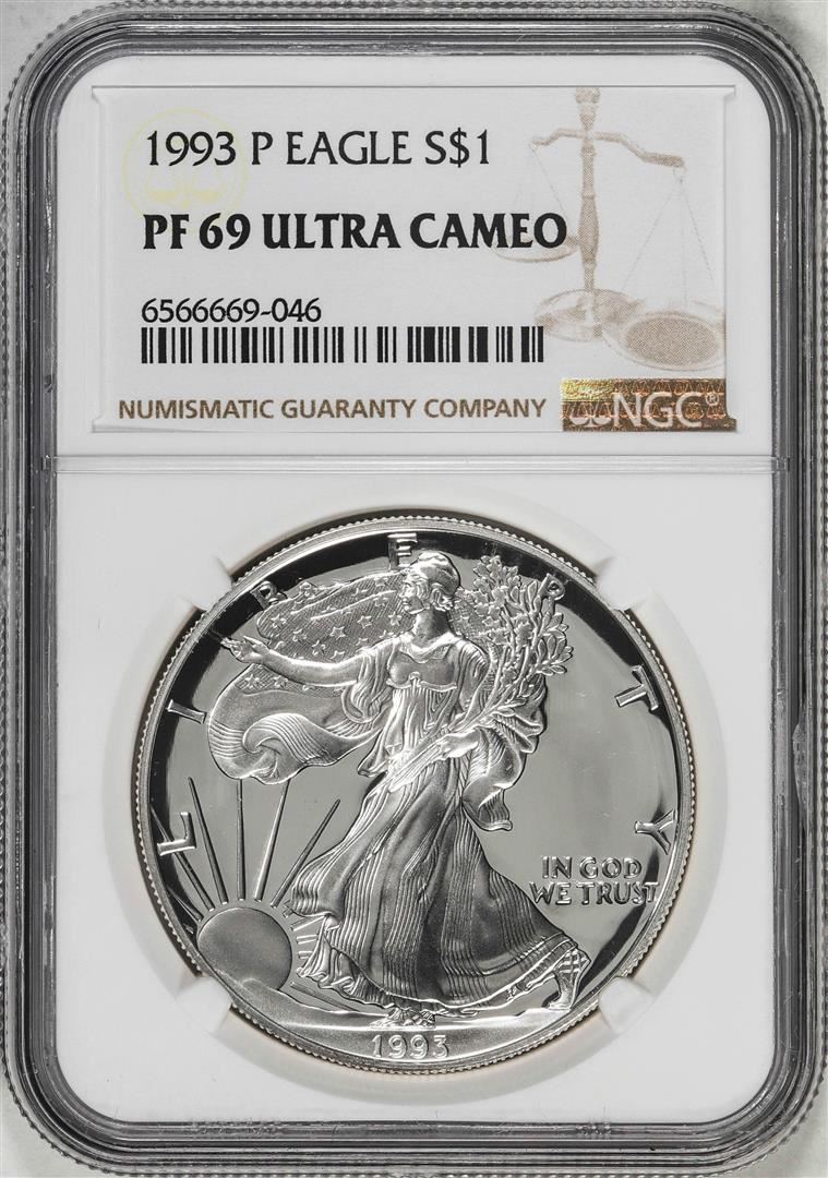 One 1993-P $1 Proof American Silver Eagle Coin NGC PF69 Ultra Cameo. NGC Certified.