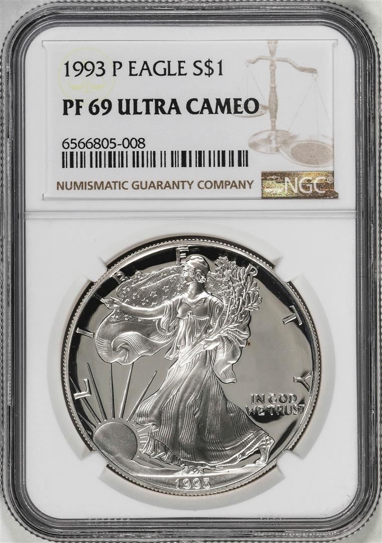 One 1993-P $1 Proof American Silver Eagle Coin NGC PF69 Ultra Cameo. NGC Certified.