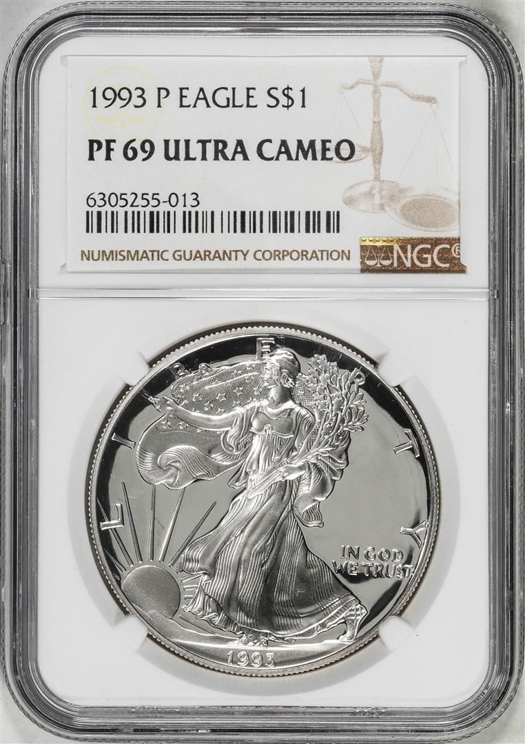 One 1993-P $1 Proof American Silver Eagle Coin NGC PF69 Ultra Cameo. NGC Certified.