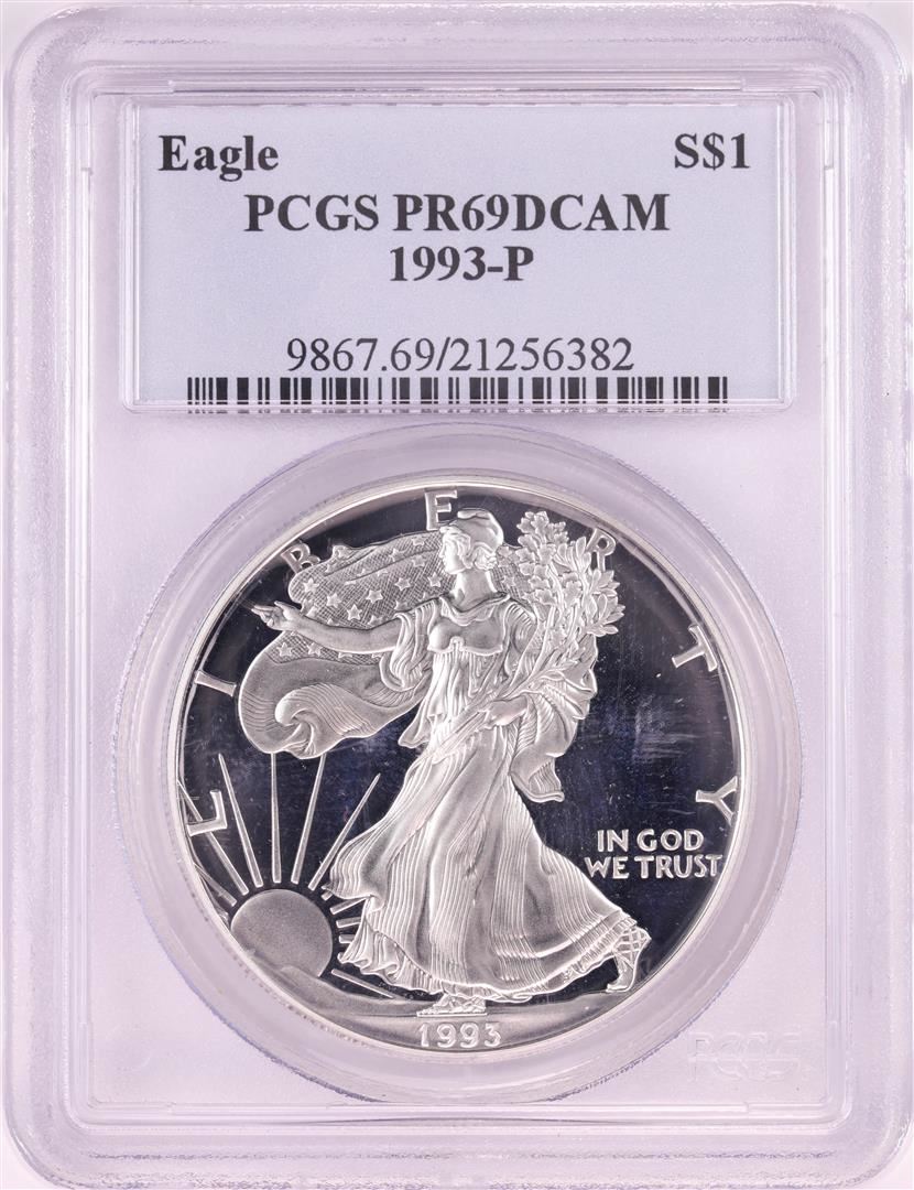 One 1993-P $1 Proof American Silver Eagle Coin PCGS PR69DCAM. PCGS Graded.