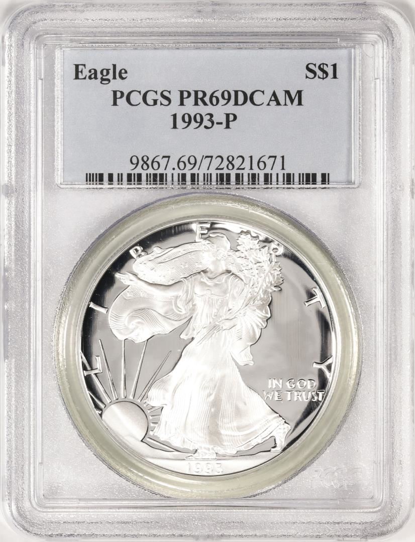 One 1993-P $1 Proof American Silver Eagle Coin PCGS PR69DCAM. PCGS Graded.