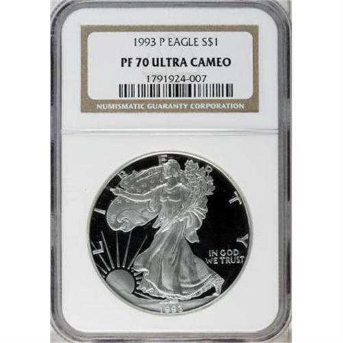 <B>1993-P $1 Silver Eagle PR70 Deep Cameo NGC.</B></I> NGC Census: (155/0). PCGS Population (18/0). Mintage: 403,625. Numismedia Wsl. Price for NGC/PCGS coin in PR70: $3,900. (#9867)<BR><BR><b>Shipping:</b> Coins & Currency (<a target="_blank" href="http://www.heritageauctions.com/common/shipping.php">view shipping information</a>)