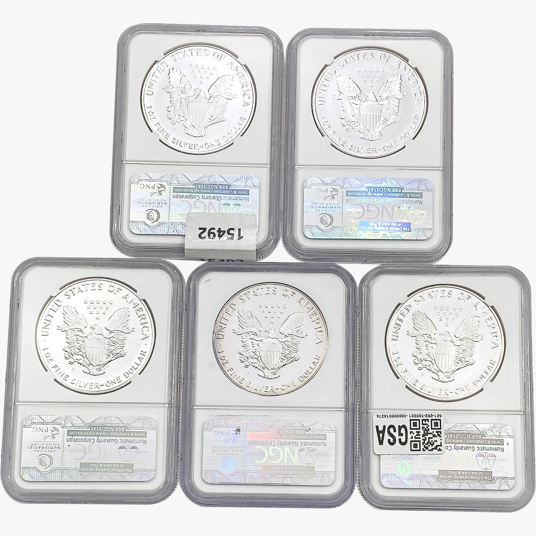 e. Coins sold referencing a third-party grading service are sold “AS IS” without any express or implied warranty, except for a guarantee by GSA that they are genuine. Removal or alteration of the holder, voids all of Bidder’s claims concerning that Product. Certain warranties may be available from the grading services and Bidders are referred to them for further details: Numismatic Guaranty Corporation (NGC), PO Box 4776, Sarasota, FL 34230, www.ngccoin.com/services/writtenguarantee.asp; Professional Coin Grading Services (PCGS), PO Box 9458, Newport Beach, CA 92658, www.pcgs.com/guarantee.html; ANACS, 6555 S. Kenton St., Ste. 303, Englewood, CO 80111; and Independent Coin Grading Co. (ICG), 7901 East Bellview, Ave., Suite 50, Englewood, CO 80111.
