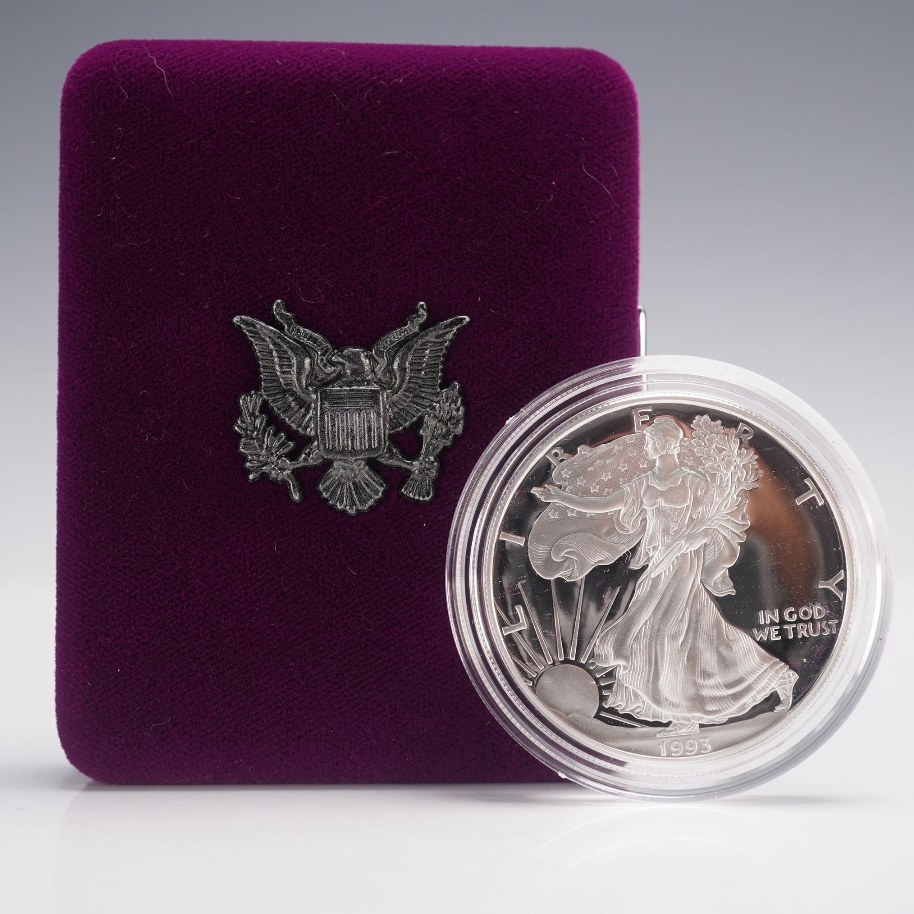 Offered is a 1993-P American Eagle one ounce silver proof coin, struck in .999 fine silver at the Philadelphia Mint. The obverse features Adolph A. Weinman's classic Walking Liberty design, showing Liberty draped in the American flag, striding toward the rising sun with branches of laurel and oak in her left arm. Inscriptions include LIBERTY and IN GOD WE TRUST. The reverse, by John M. Mercanti, depicts a heraldic eagle with shield, arrows, and olive branch, with lettering UNITED STATES OF AMERICA, E PLURIBUS UNUM, and 1 OZ. FINE SILVER - ONE DOLLAR. Bearing the P mint mark, this proof issue displays frosted devices and deeply mirrored fields. It is housed in its original U.S. Mint purple velvet presentation case with silver Great Seal emblem, and comes with the matching outer box. A highly desirable proof silver Eagle admired for its artistry, silver content, and historic Philadelphia Mint origin.