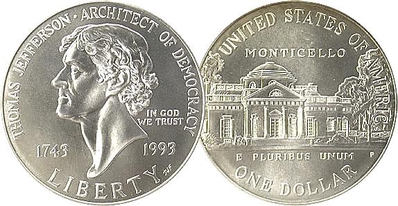 1993-P SILVER THOMAS JEFFERSON COMMEMORATIVE DOLLAR-CH BU+