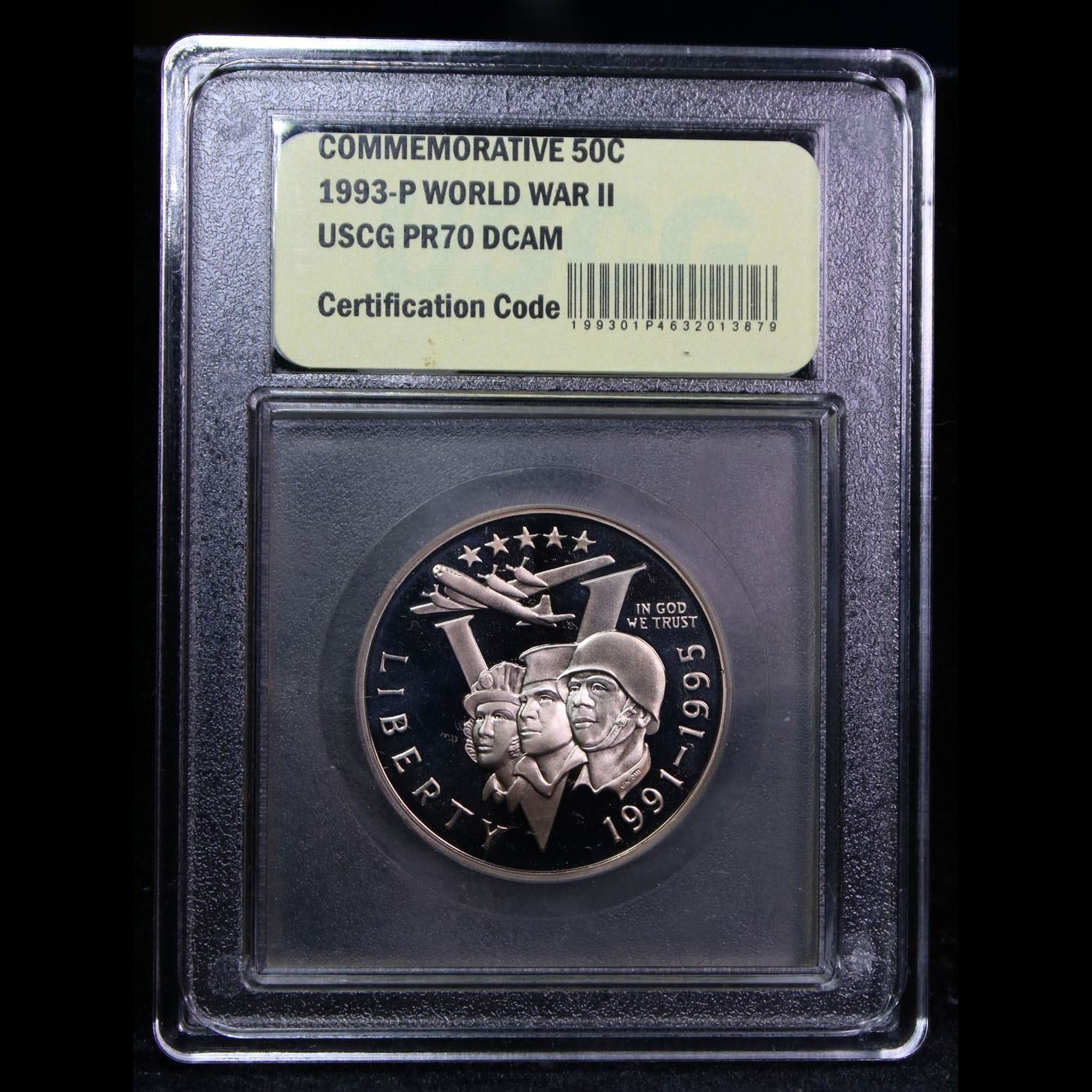 1993--P WWII World War II . . Modern Commem Half Dollar 50c Graded GEM++ Proof Deep Cameo by USCG. The Commemorative was released in 1993 and bears the dates 1991 and 1995 which signifies the 50th anniversary of WWII. Proof Half Dollar World War II Commemorative, Encapsulated and Graded Perfection Gem+++ Proof DCAM by USCG.