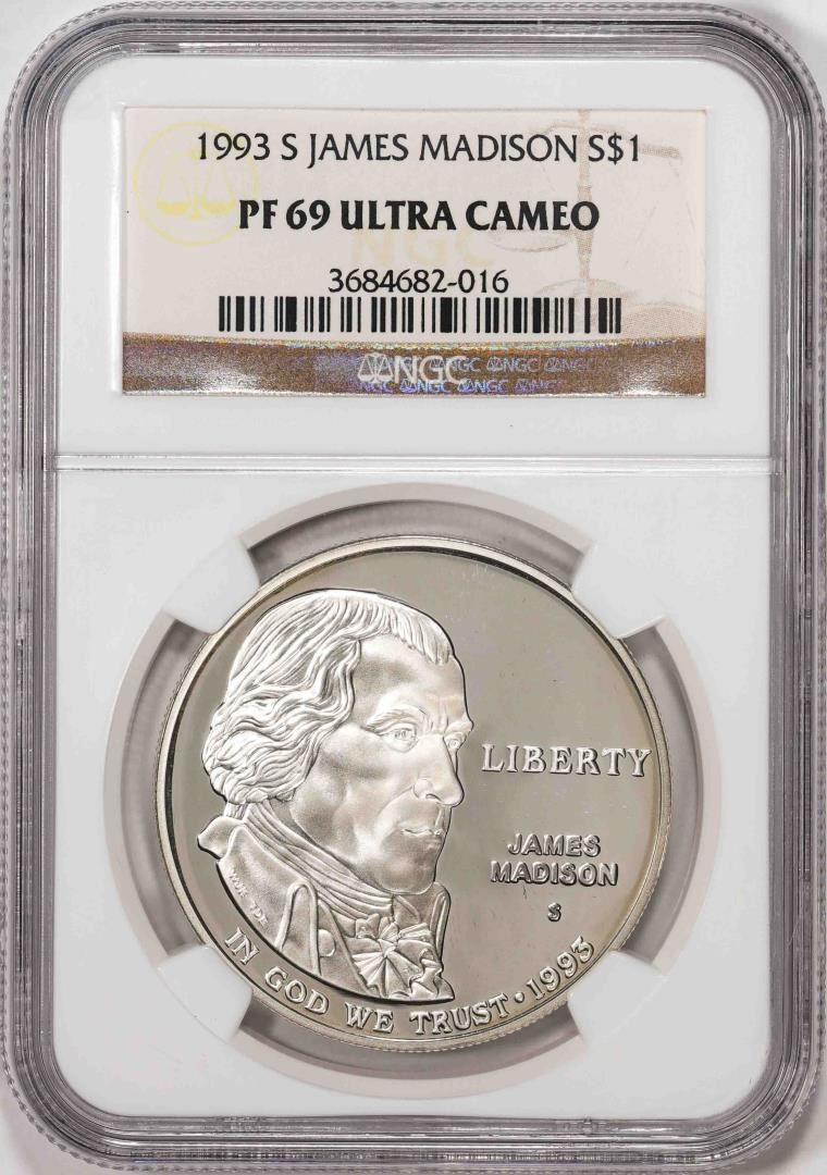 One 1993-S $1 Proof James Madison Commemorative Silver Dollar Coin NGC PF69 Ultra Cameo. NGC Certified.