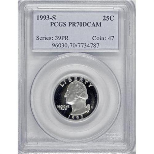 <B>1993-S 25C Clad PR70 Deep Cameo PCGS.</B></I> PCGS Population (109/0). NGC Census: (110/0). Numismedia Wsl. Price for NGC/PCGS coin in PR70: $140. (#96030)<BR><BR><b>Shipping:</b> Coins & Currency (<a target="_blank" href="http://www.heritageauctions.com/common/shipping.php">view shipping information</a>)