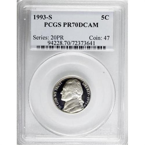 <B>1993-S 5C PR70 Deep Cameo PCGS.</B></I> PCGS Population (91/0). NGC Census: (113/0). Numismedia Wsl. Price for NGC/PCGS coin in PR70: $125. (#94228)<BR><BR><b>Shipping:</b> Coins & Currency (<a target="_blank" href="http://www.heritageauctions.com/common/shipping.php">view shipping information</a>\)