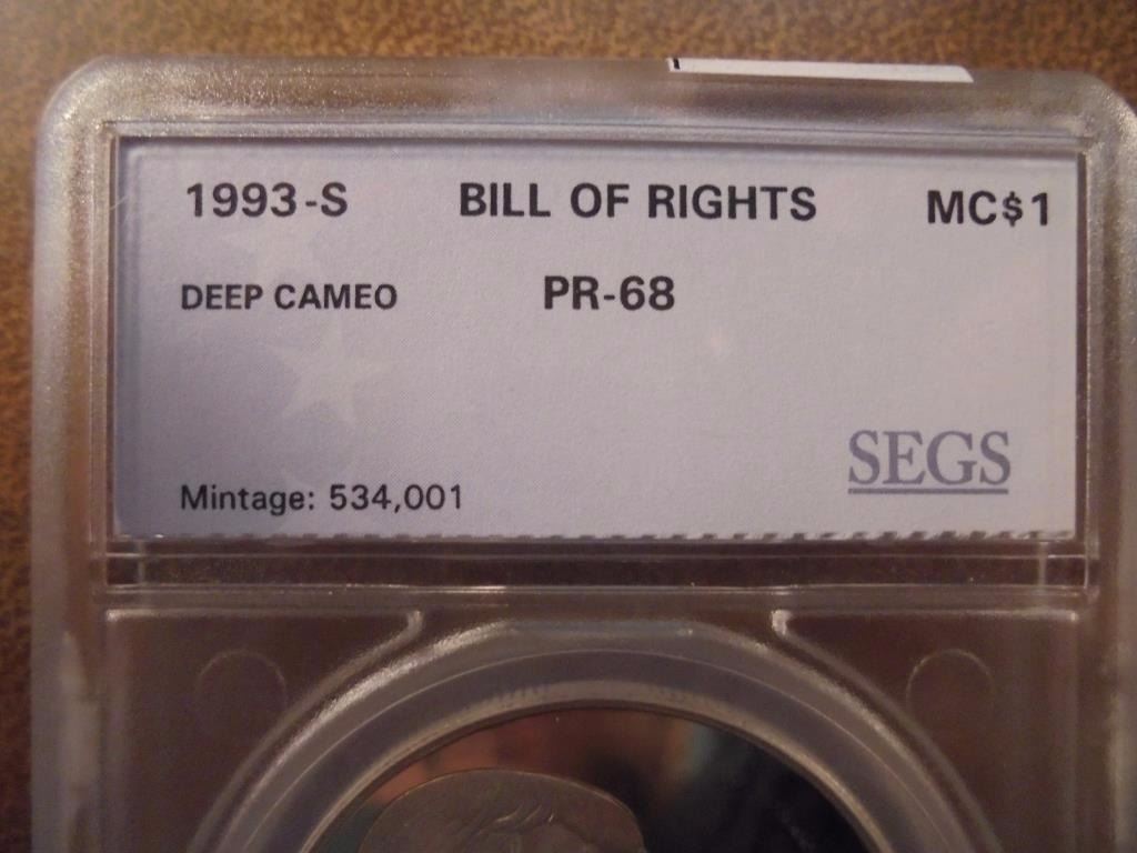 1993-S BILL OF RIGHTS SILVER DOLLAR SEGS SLAB