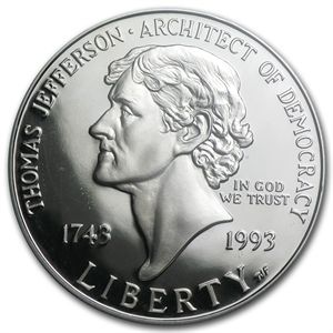 1993-S Jefferson 250th Anniv. $1 Silver Commem PR-69 DC **|**|** Year: 1993 ; Mint Mark: PR-69 DCAM ; Grade: S - San Francisco ; Denomination: 1 ; MSRP: $100