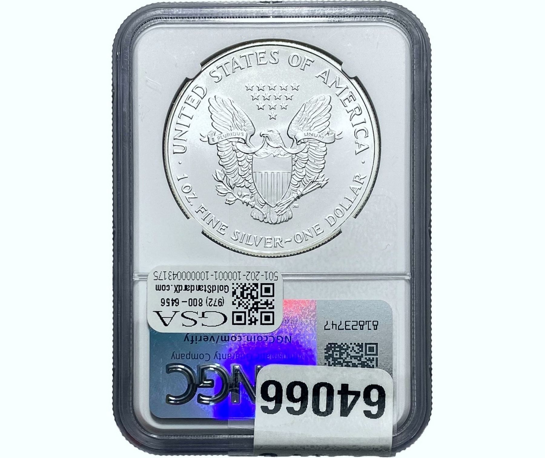 e. Coins sold referencing a third-party grading service are sold “AS IS” without any express or implied warranty, except for a guarantee by GSA that they are genuine. Removal or alteration of the holder, voids all of Bidder’s claims concerning that Product. Certain warranties may be available from the grading services and Bidders are referred to them for further details: Numismatic Guaranty Corporation (NGC), PO Box 4776, Sarasota, FL 34230, www.ngccoin.com/services/writtenguarantee.asp; Professional Coin Grading Services (PCGS), PO Box 9458, Newport Beach, CA 92658, www.pcgs.com/guarantee.html; ANACS, 6555 S. Kenton St., Ste. 303, Englewood, CO 80111; and Independent Coin Grading Co. (ICG), 7901 East Bellview, Ave., Suite 50, Englewood, CO 80111.