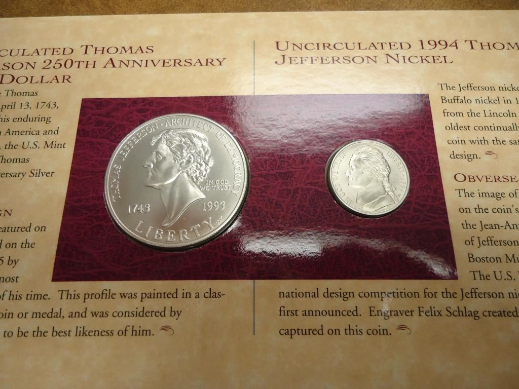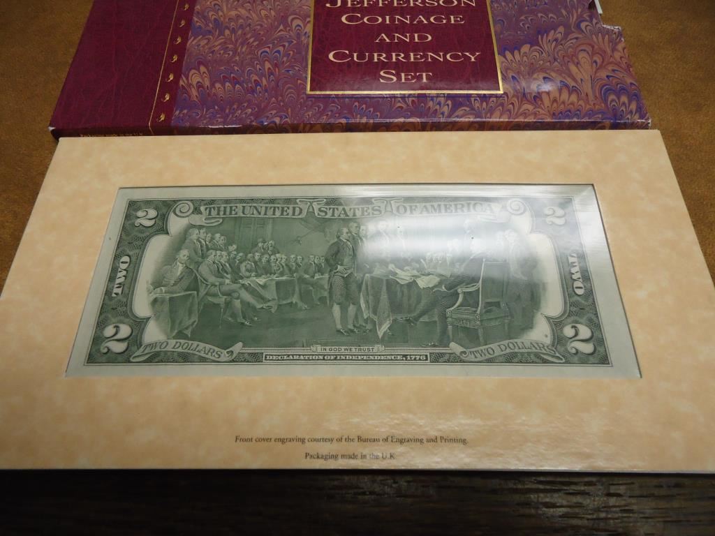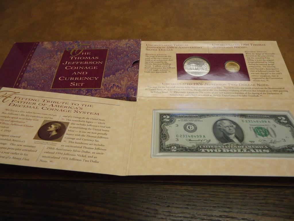 1993 THOMAS JEFFERSON COINAGE & CURRENCY SET INCLUDES SILVER DOLLAR, JEFFERSON NICKEL AND $2 NOTE, O