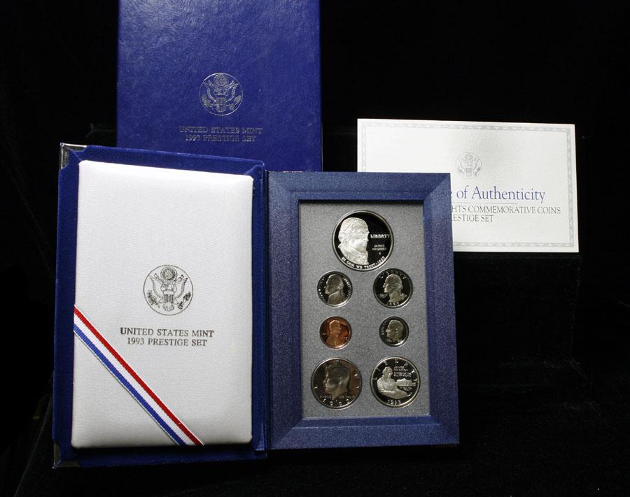 Contains the 1993 Bill of Rights 90% silver US Silver Dollar & the 1993 Bill of Rights Half Dollar plus the Traditional 5 pieces 1993 Proof Set. Includes all the original packaging and the COA. Note at current Silver prices the Bonus Silver Dollar (.7736 troy oz. pure silver) and Silver Half Dollar (.3617 troy oz. pure silver) alone would Melt at over $30.00!