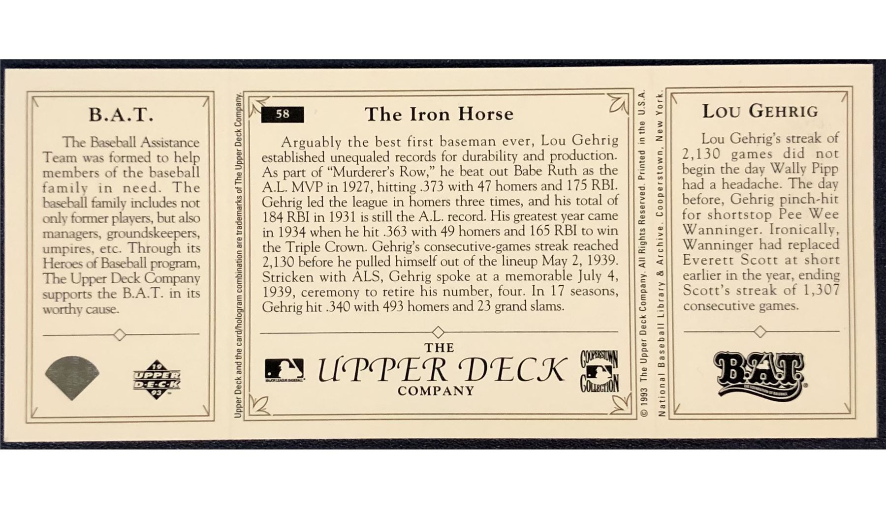 1993 Upper Deck BAT The Foundation Of Baseball Triple Folder - LOU GEHRIG (HOF)