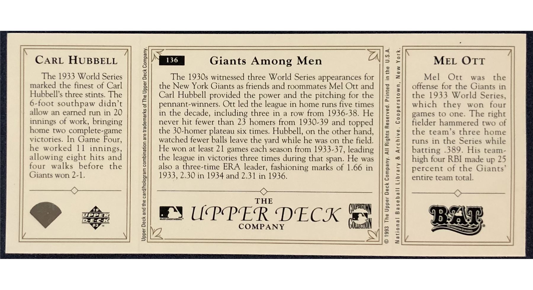 1993 Upper Deck BAT The Foundation Of Baseball Triple Folder - MEL OTT / CARL HUBBELL (HOF)