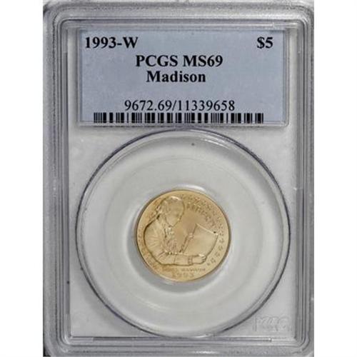 <B>1993-W G$5 Bill of Rights Gold Five Dollar MS69 PCGS.</B></I> PCGS Population (716/109). NGC Census: (389/577). Mintage: 23,266. Numismedia Wsl. Price for NGC/PCGS coin in MS69: $225. (#9672)<BR><BR><b>Shipping:</b> Coins & Currency (<a target="_blank" href="http://www.heritageauctions.com/common/shipping.php">view shipping information</a>)