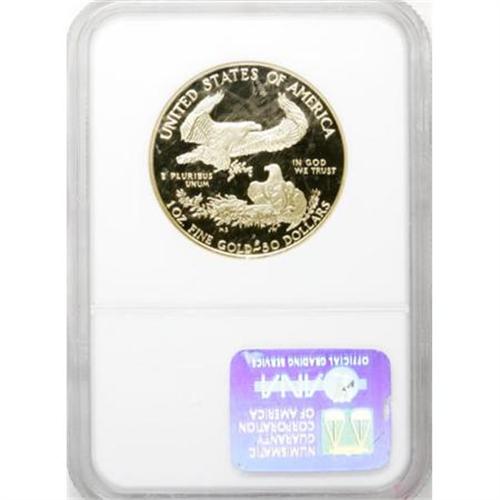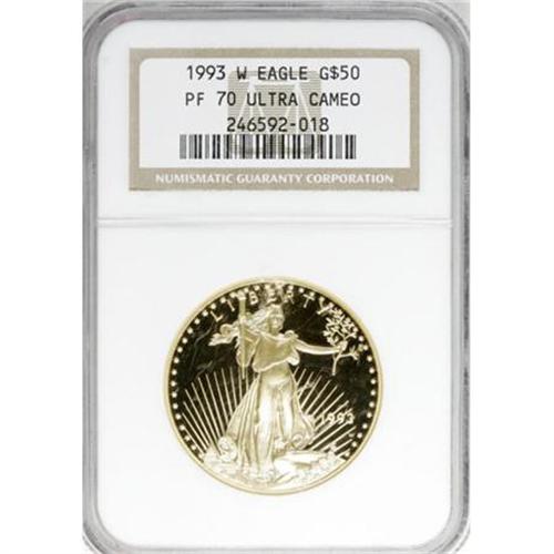 <B>1993-W G$50 One-Ounce Gold Eagle PR70 Ultra Cameo NGC.</B></I> Another example from fairly early in the American Eagle gold series, which has seen lower mintages the last few years. The pristine, black-on-gold surfaces are trouble-free; any scrapes are on the encapsulation.<BR><BR><b>Shipping:</b> Coins & Currency (<a target="_blank" href="http://www.heritageauctions.com/common/shipping.php">view shipping information</a>)