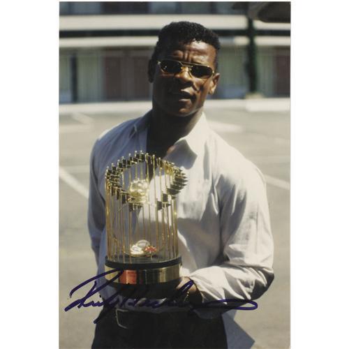 <B>1993 World Series Player's Trophy Presented to Rickey Henderson.</B></I> Worthy of tremendous collecting interest merely as a symbol of baseball's highest achievement, this World Series Championship trophy glimmers that much more brightly for the identity of its former owner. As a 1994 signed letter of provenance from "Man of Steal Sports" attests, this trophy is one of two that belonged to Henderson, awarded for his part in securing a second consecutive World Series victory for the Toronto Blue Jays. A signed photograph (4x6") of Henderson holding the trophy is likewise included, and a second Henderson signed photo (8x10") of the Jays' celebration after recording the Series' final out.<BR><BR> The distinctive styling of this award features a ring of flags announcing every Major League team, with a crown and baseball sculpture at center. Pins sporting the logo of the Blue Jays and Phillies, who met that October, are positioned in front. Ringing the base of the foot-tall trophy is a golden band, which is engraved, "World Series Champions, Toronto Blue Jays, 1993, Rickey Henderson." The "Balfour" manufacturer's sticker is underneath the base. With Henderson's Hall of Fame induction both certain and soon, now is the perfect time to invest in such an elite piece.<BR><BR><b>Shipping:</b> Miscellaneous Collectibles, Larg (<a target="_blank" href="http://www.heritageauctions.com/common/shipping.php">view shipping information</a>)