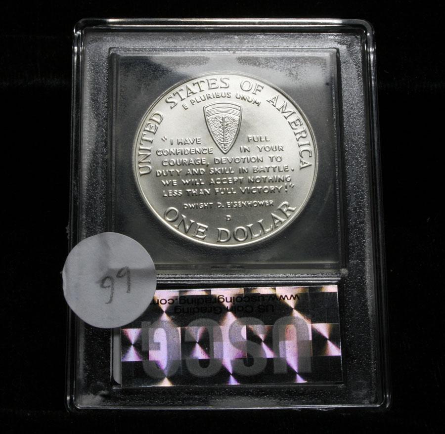 The Commemorative was released in 1993 and bears the dates 1991 and 1995 which signifies the 50th anniversary of WWII. PCGS lists an ms70 at $425. This perfect example was certified as ms70 by USCG. Estimated Value $125