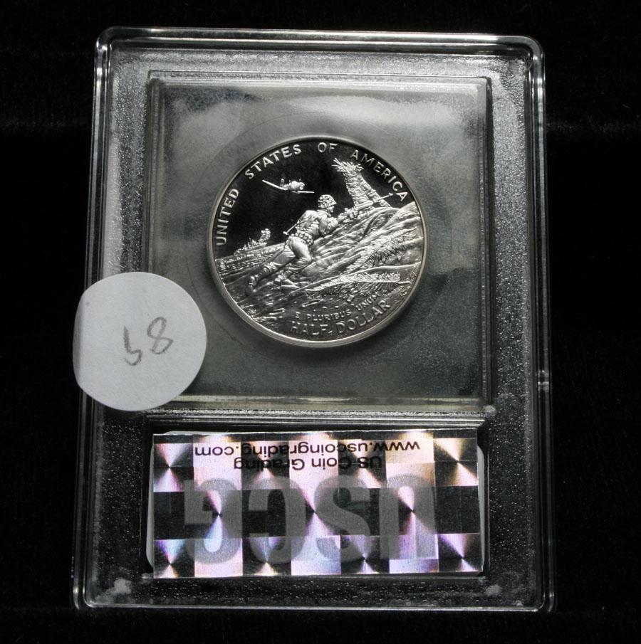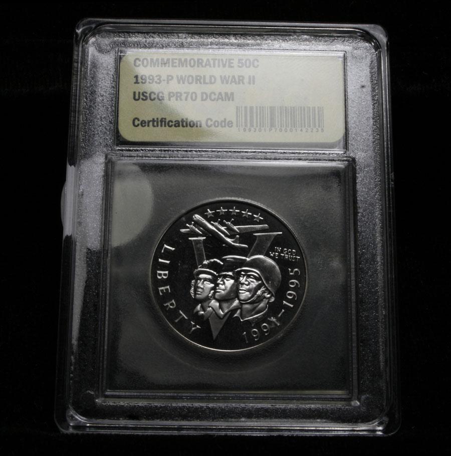 The Commemorative was released in 1993 and bears the dates 1991 and 1995 which signifies the 50th anniversary of WWII. Proof Half Dollar World War II Commemorative, Encapsulated and Graded PF70 DCAM by USCG. Estimated Value $250