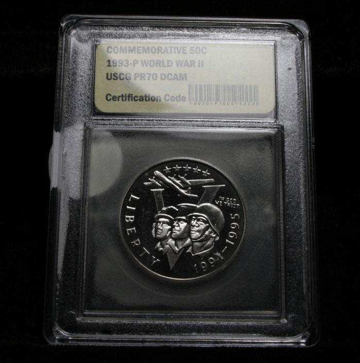 The Commemorative was released in 1993 and bears the dates 1991 and 1995 which signifies the 50th anniversary of WWII. Proof Half Dollar World War II Commemorative, Encapsulated and Graded PF70 DCAM by USCG. Estimated Value $250