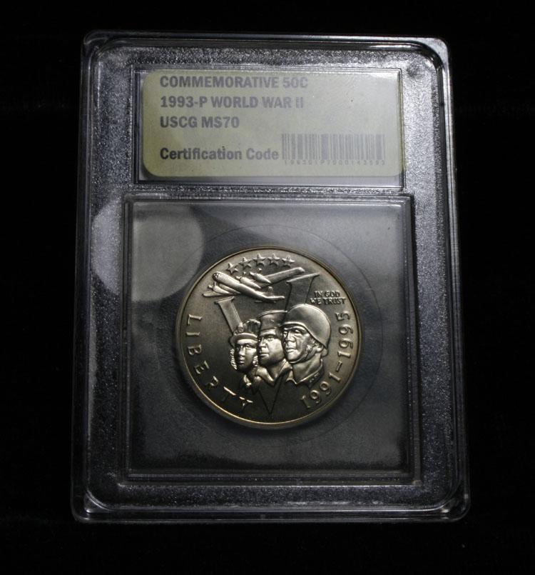 The Commemorative was released in 1993 and bears the dates 1991 and 1995 which signifies the 50th anniversary of WWII. This Uncirculated Half Dollar World War II Commemorative is encapsulated and graded ms70 by USCG. PCGS lists ms70 at $300. Estimated Value $100