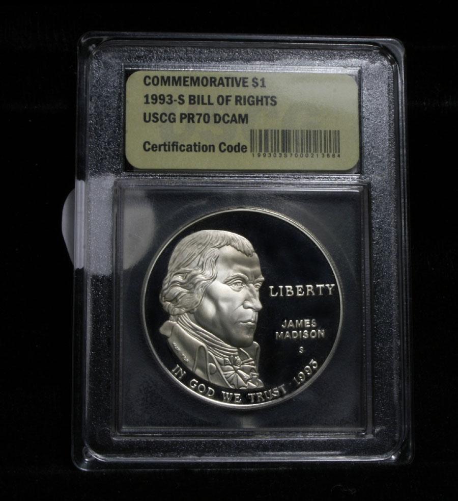 This Proof One Dollar Silver Coin Commemorates James Madison and the Bill of Rights.  This Example was Graded PR70 Deep Cameo by USCG.  PCGS lists PR70 DCAM at $925.   Estimated Value $250