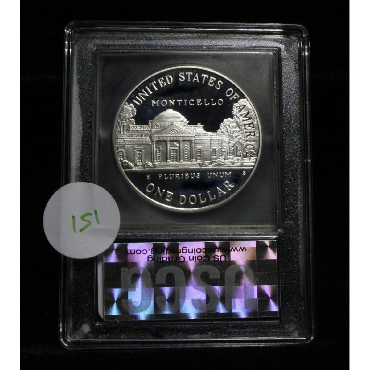 The 1993 Thomas Jefferson Silver Dollar was actually issued in 1994 although the coins are dated 1993. The commemorative coins were issued to celebrate the 250th anniversary of Thomas Jefferson's birth. This is a perfect example Encapsulated and Graded PR70 DCAM by USCG. PCGS lists PR70 DCAM as $1500. Estimated Value $350