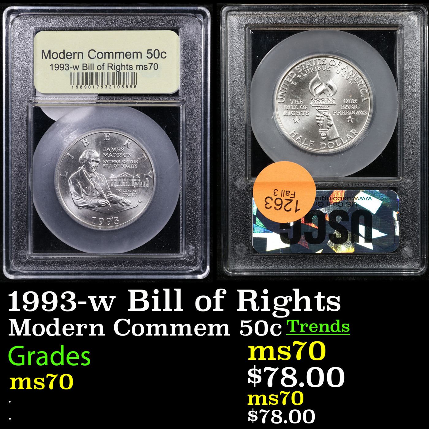 1993-w Bill of Rights Modern Commem Half Dollar 50c Graded ms70, Perfection By USCG