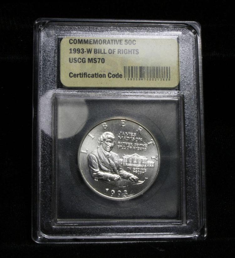 One of only 2 modern commemorative half dollars to be struck in silver. Just this and the George Washington half have been struck in silver. This coin commemorates James Madison and the Bill of Rights. This example was Graded ms70 perfection by USCG. PCGS lists ms70 at $325. Estimated Value $100