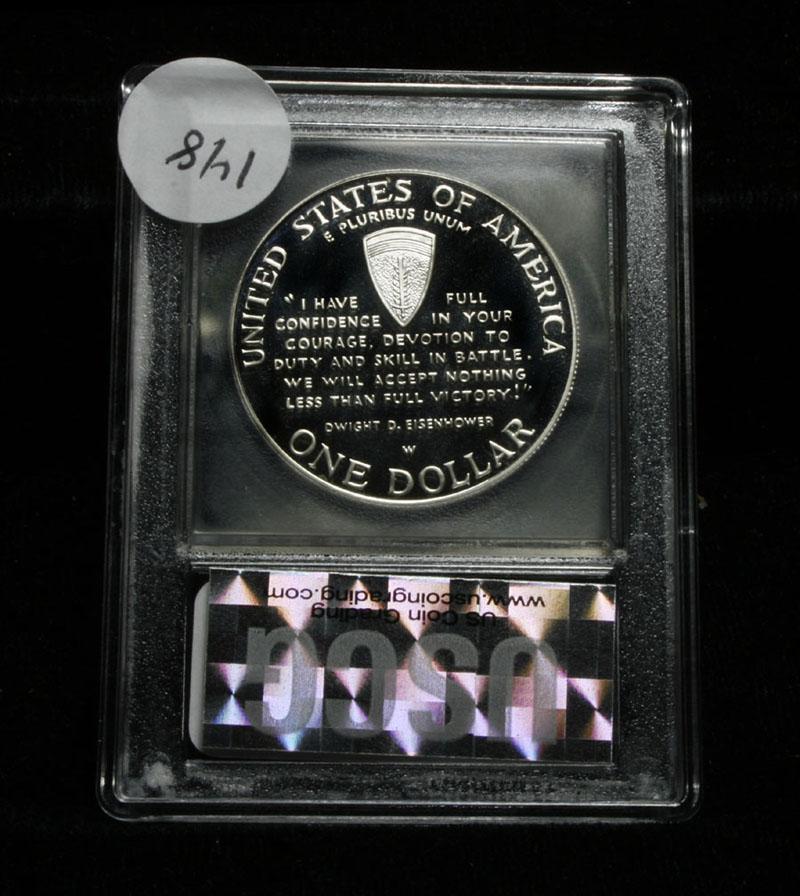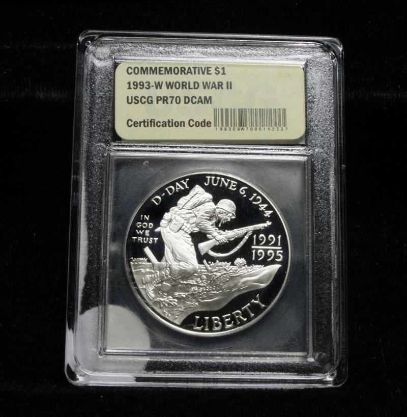 The Commemorative was released in 1993 and bears the dates 1991 and 1995 which signifies the 50th anniversary of WWII. PCGS lists a PR70 DCAM at $1650. This perfect example was certified as PR70 Deep Cameo by USCG. Estimated Value $350
