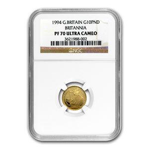 1994 1/10 oz Proof Gold Britannia PF-70 UCAM NGC - Regi **|**|** Population of 2! A great coin at a great price! Don't miss out on this one. This coin contains .10 oz of actual Gold weight. NGC has certified this coin as a Proof 70, with the further designation of Ultra Cameo. If you are looking to diversify your Gold ; MSRP: $1200