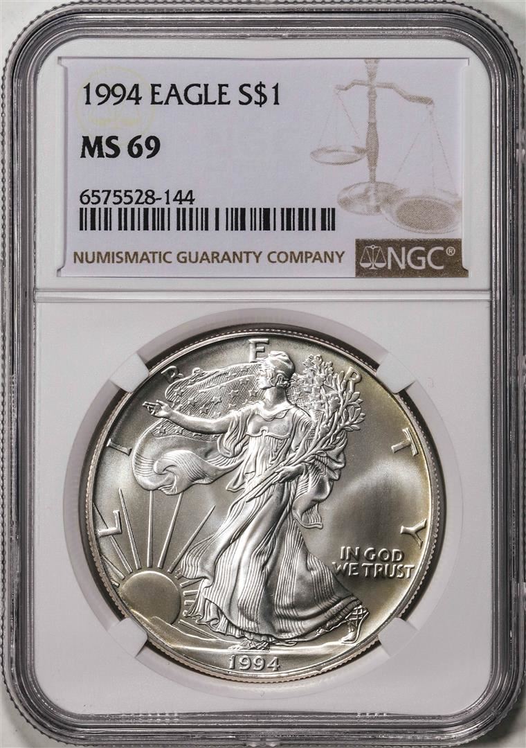One 1994 $1 American Silver Eagle Coin NGC MS69. NGC Certified.