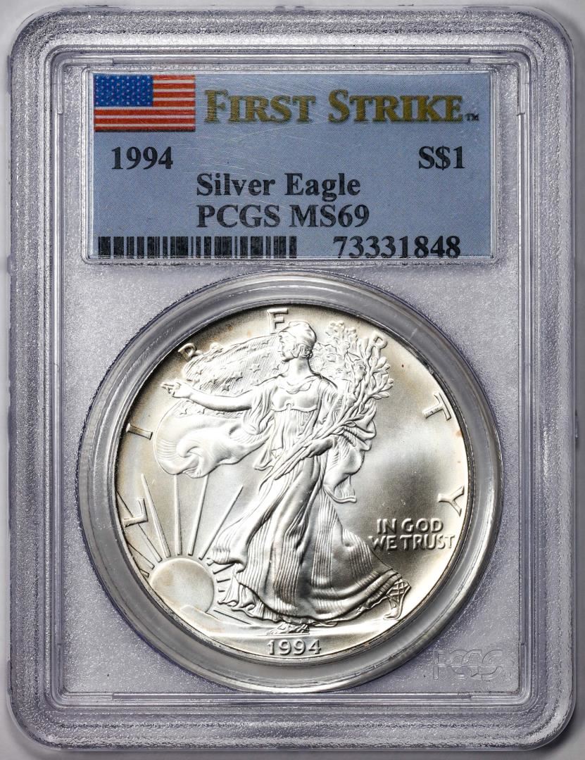 One 1994 $1 American Silver Eagle Coin PCGS MS69 First Strike. PCGS Graded.