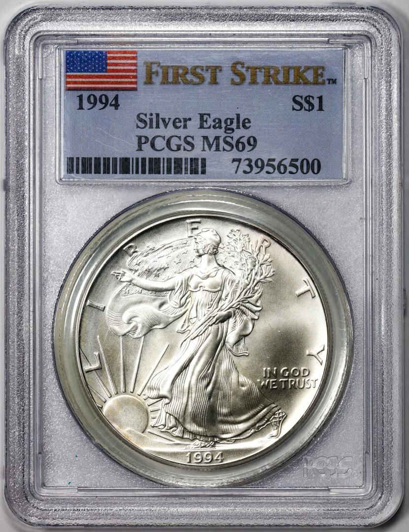 One 1994 $1 American Silver Eagle Coin PCGS MS69 First Strike. PCGS Graded.