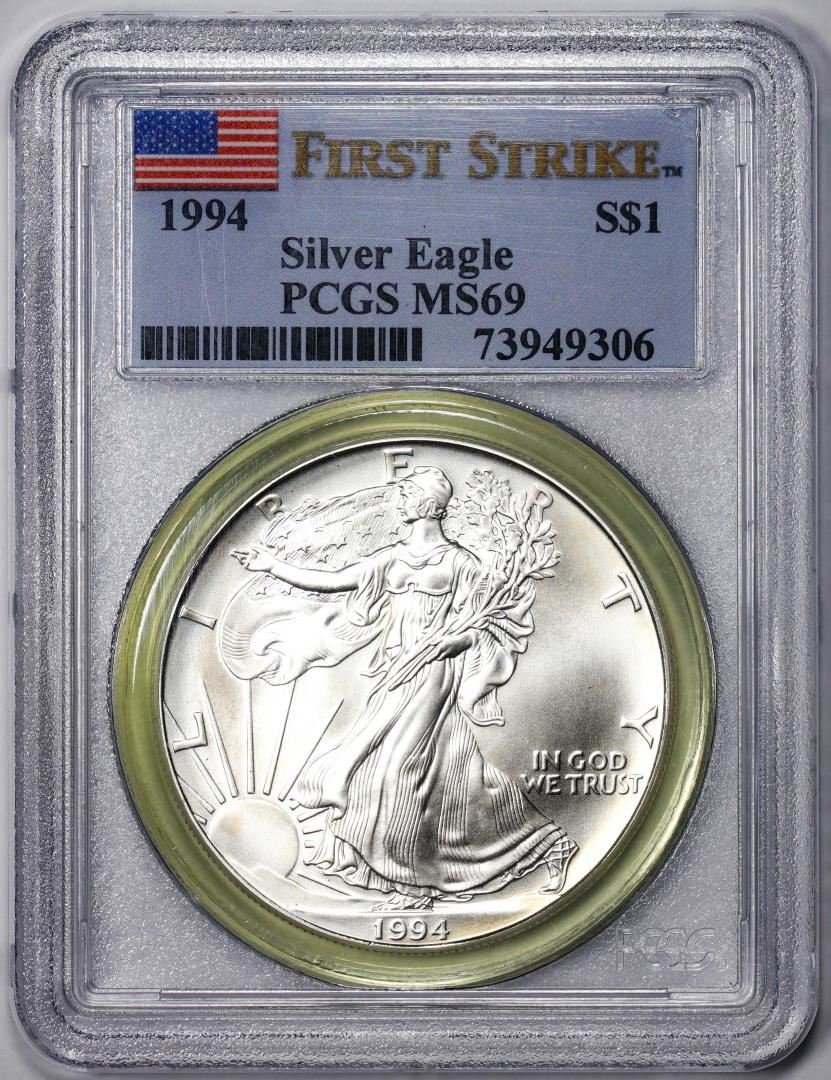 One 1994 $1 American Silver Eagle Coin PCGS MS69 First Strike. PCGS Graded.