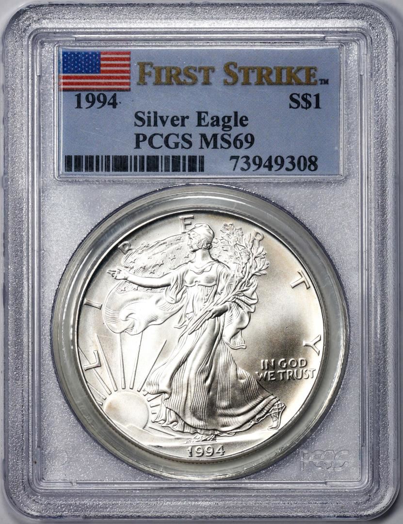 One 1994 $1 American Silver Eagle Coin PCGS MS69 First Strike. PCGS Graded.