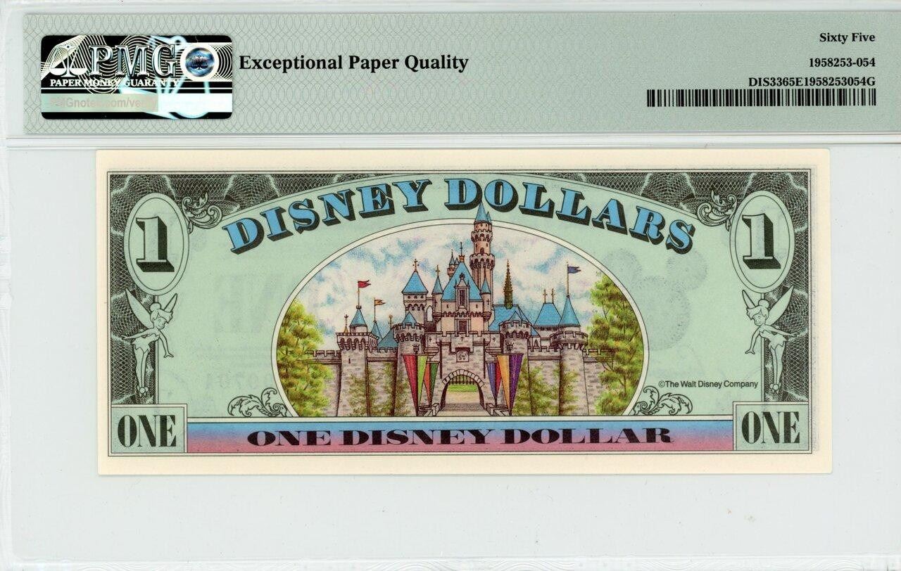 One 1994 $1 Mickey Disney Dollar PMG 65EPQ.